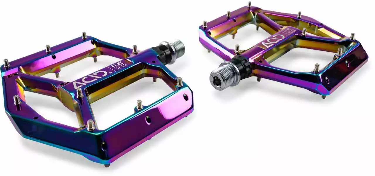 | Features | leichtes Flat-Pedal; CNC-veredelter Aluminiumkörper und CrMo Achse; angefaste Kanten für erhöhte Bodenfreiheit in Kurven; große Standfläche; extrem flache Bauweise; neun austauschbare und einstellbare Pins pro Seite; gedichtetes Patronengleitlager und zwei gedichtete Industrielager |
