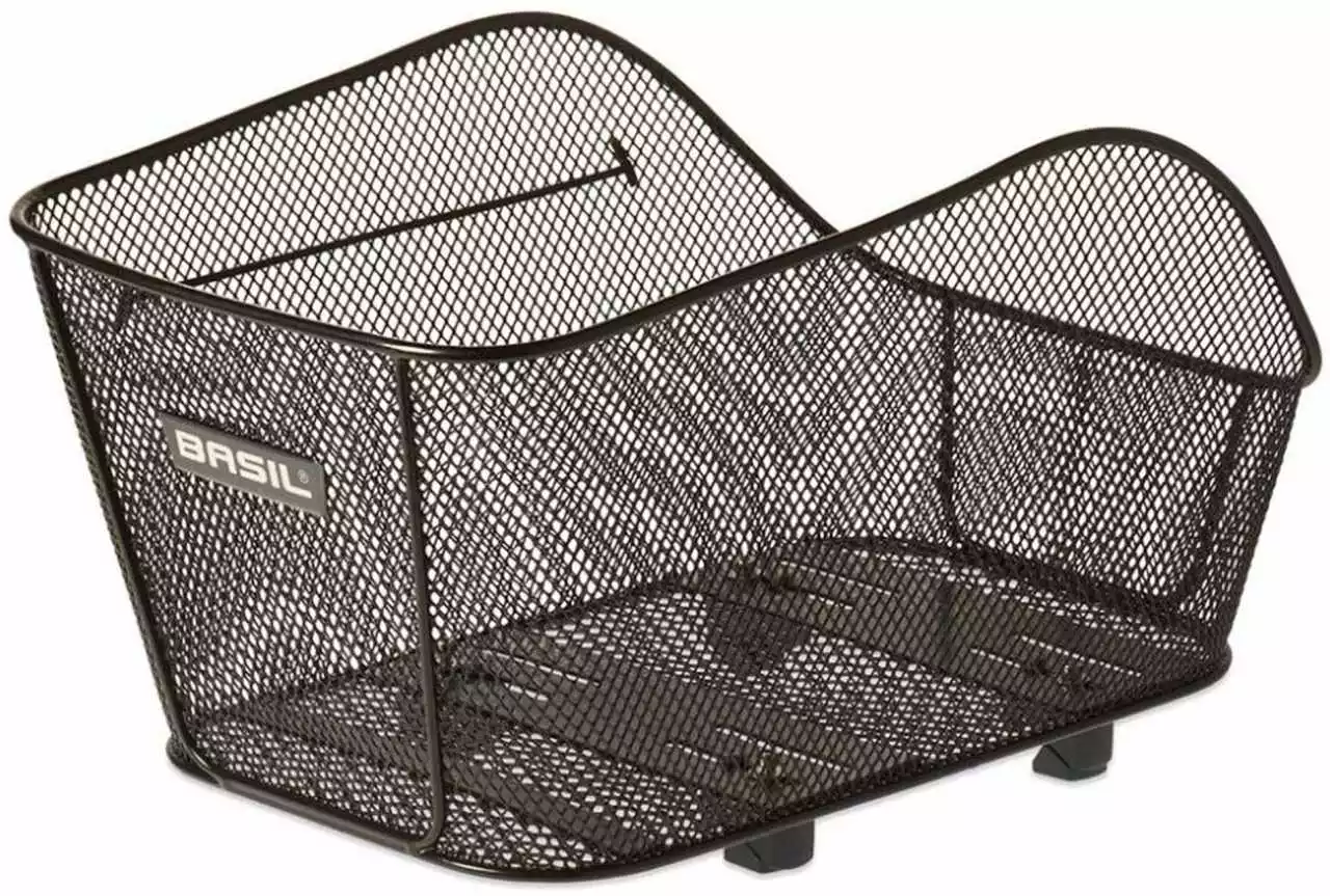 Das Modell Basil Icon M ist ein schwarzer Fahrradkorb für den Gepäckträger versehen mit feinmaschigem Stahl, geeignet für WSL-System und alle Gepäckträger (auch E-Bikes).