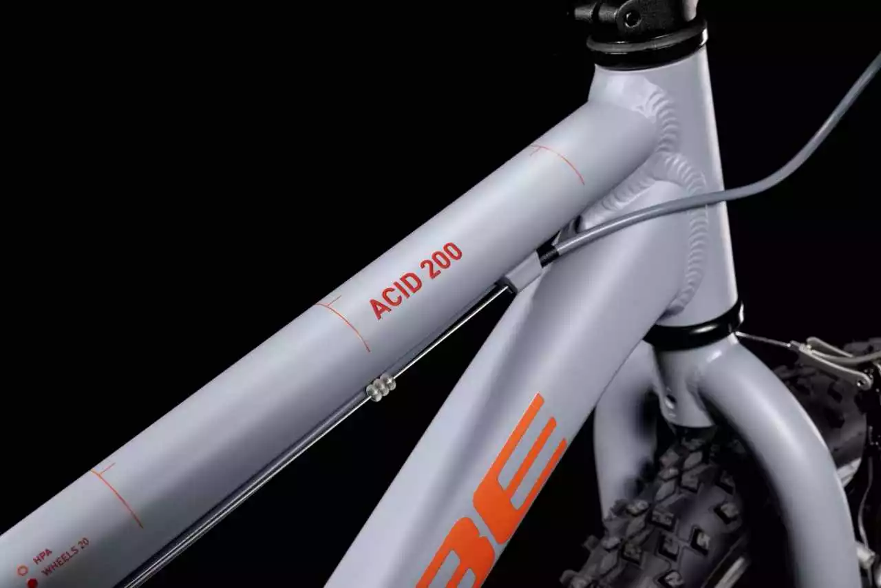 Der unter Hitze behandelte 6061-Aluminiumrahmen des Acid 200 bietet die gleiche Qualität und Haltbarkeit wie die Mountainbikes für Erwachsene. Dank eines speziell geformten, gebogenen Unterrohrs, das genau auf die Körpergröße junger Fahrer abgestimmt ist, ist es außerdem extrem leicht und stabil. V-Bremsen an Vorder- und Hinterrad funktionieren auch wie bei Mamas und Papas Fahrrädern. Und da auf dem Weg zum Profi auf dem Rad der ein oder andere Sturz vorprogrammiert ist, lässt sich das Schaltauge einfach austauschen. Es muss nicht der gesamte Rahmen auf einmal ausgetauscht werden.