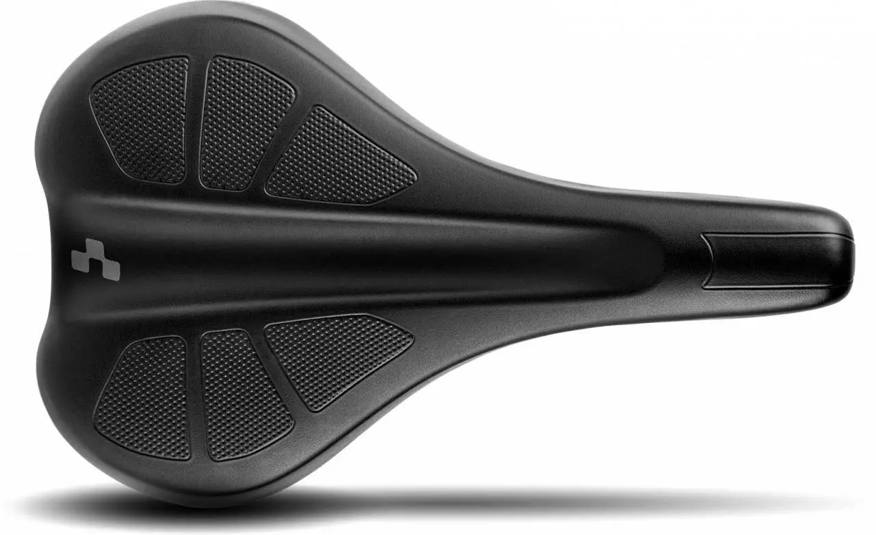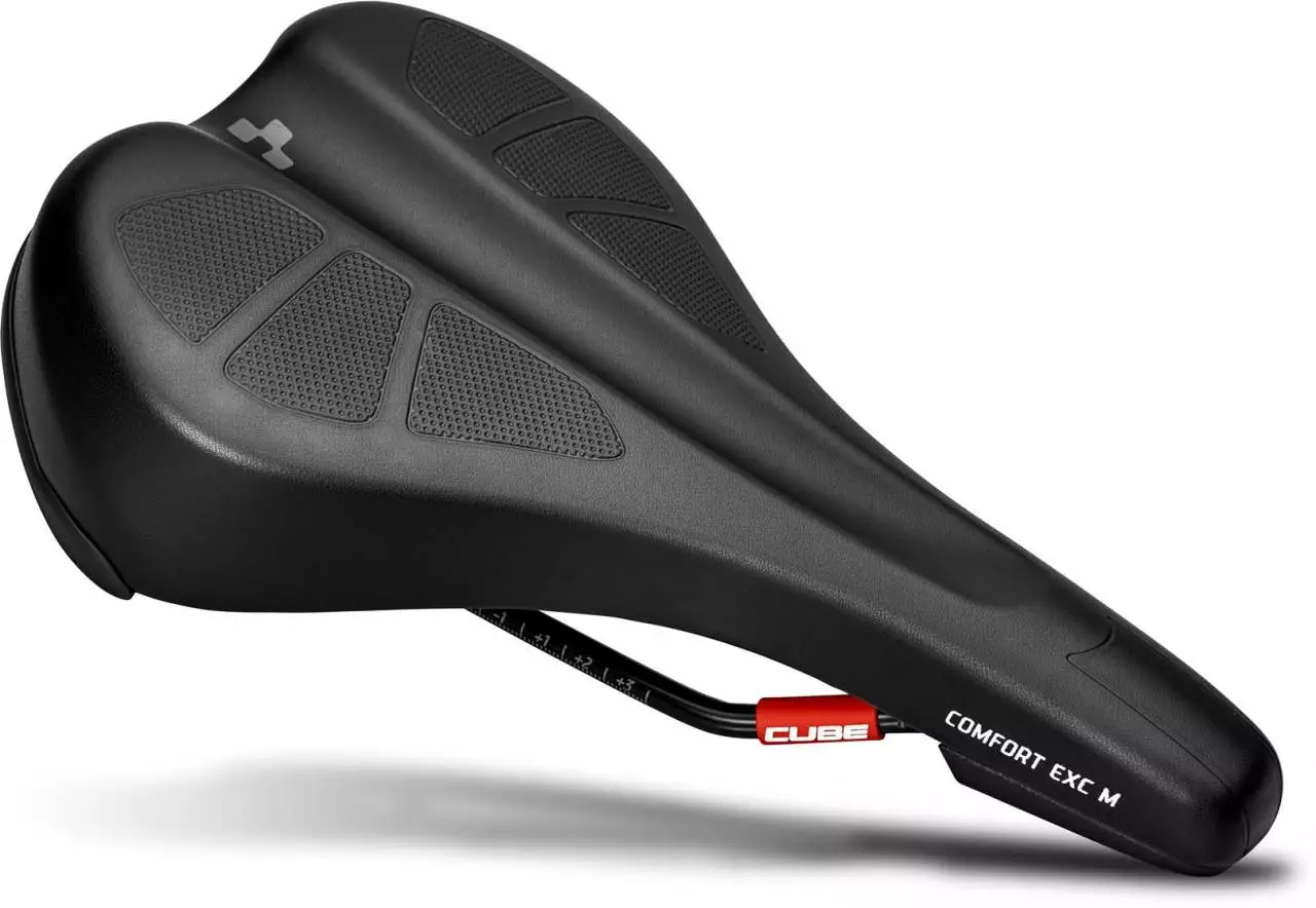 COMFORT EXC Sattel mit ergonomischer Vertiefung, GF-verstärkte Nylon-Sattelschale, CrMo-Sattelgestell mit Laserdruck, PU Polsterung, Polster-Level 4, Mikrofaser-Obermaterial, CUBE Protection Shield