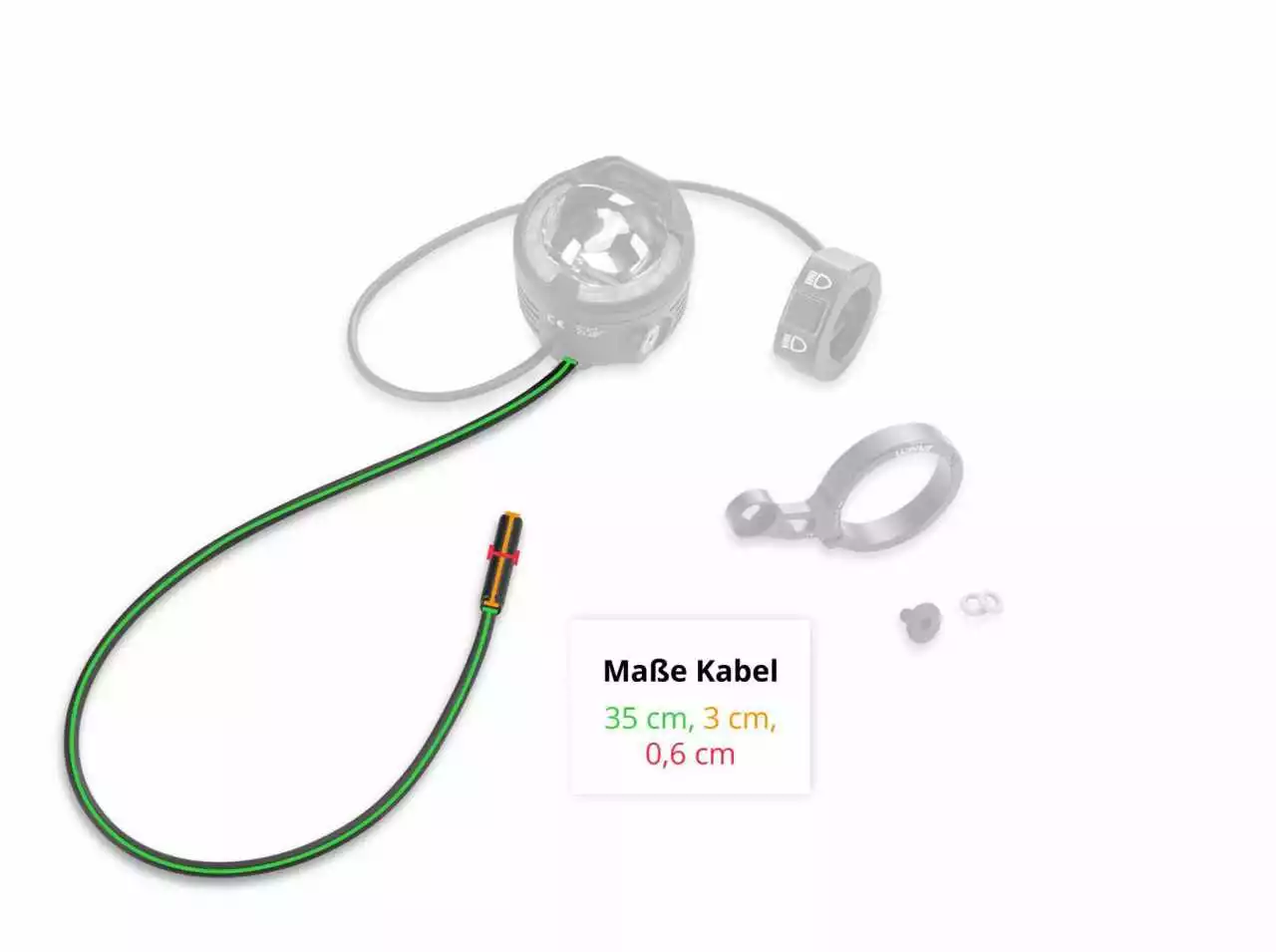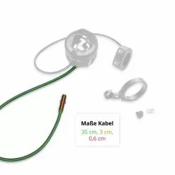 Lichtkabel mit Steckverbindung: Lichtkabellänge 96,5cm (80cm + 16,5 cm), zusammen mit dem Kabel am Scheinwerfer ergibt sich eine Gesamtlänge von 1,33m.