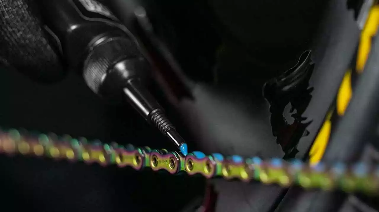 - Schütteln Sie die Flasche kräftig und tragen Sie eine mäßige Menge Hydrodynamic-Schmiermittel auf das innere Kettenglied auf, während Sie die Pedale im Rückwärtsgang drehen.