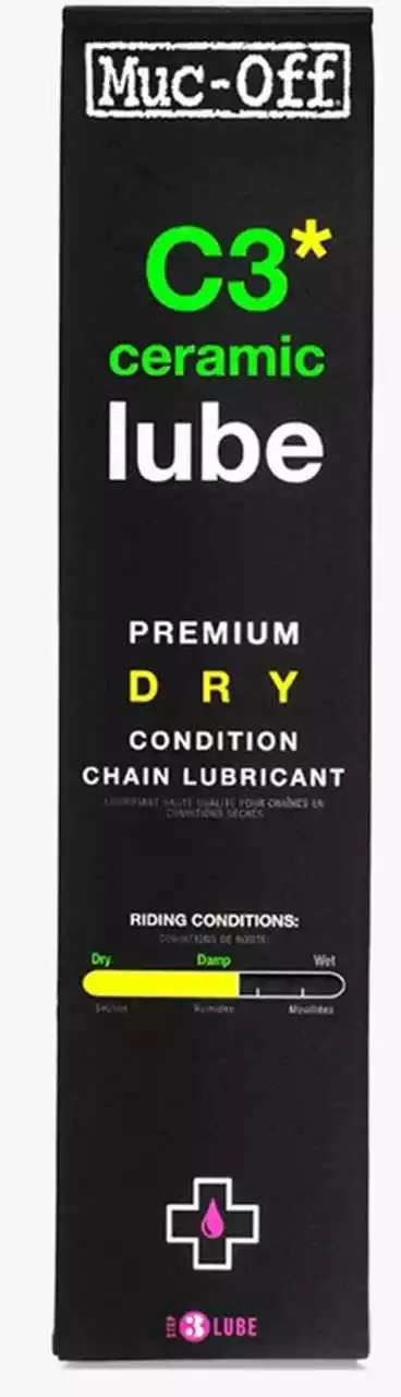 C3 Dry Ceramic Chain Lube setzt neue Maßstäbe, wenn es darum geht, die ultimative Schmierung zu bieten. Es bietet vollständigen Korrosionsschutz und unvergleichliche Leistung in trockenen, staubigen und feuchten Bedingungen. Durch den Zusatz von Nano-Keramikpartikeln und synthetischen Polymeren maximiert C3 Dry Ceramic Chain Lube Ihre Leistung, indem es den Kontakt von Metall zu Metall auf ein bahnbrechend niedriges Niveau reduziert und eine bis zu 10-mal höhere Leistung als herkömmliche Kettenöle und -schmiermittel bietet. Das Forschungs- und Entwicklungsteam von Muc-Off hat definitiv nicht an der falschen Stelle gespart, als es die Zukunft der Fahrradschmierstoffe für die breite Masse vorstellte.