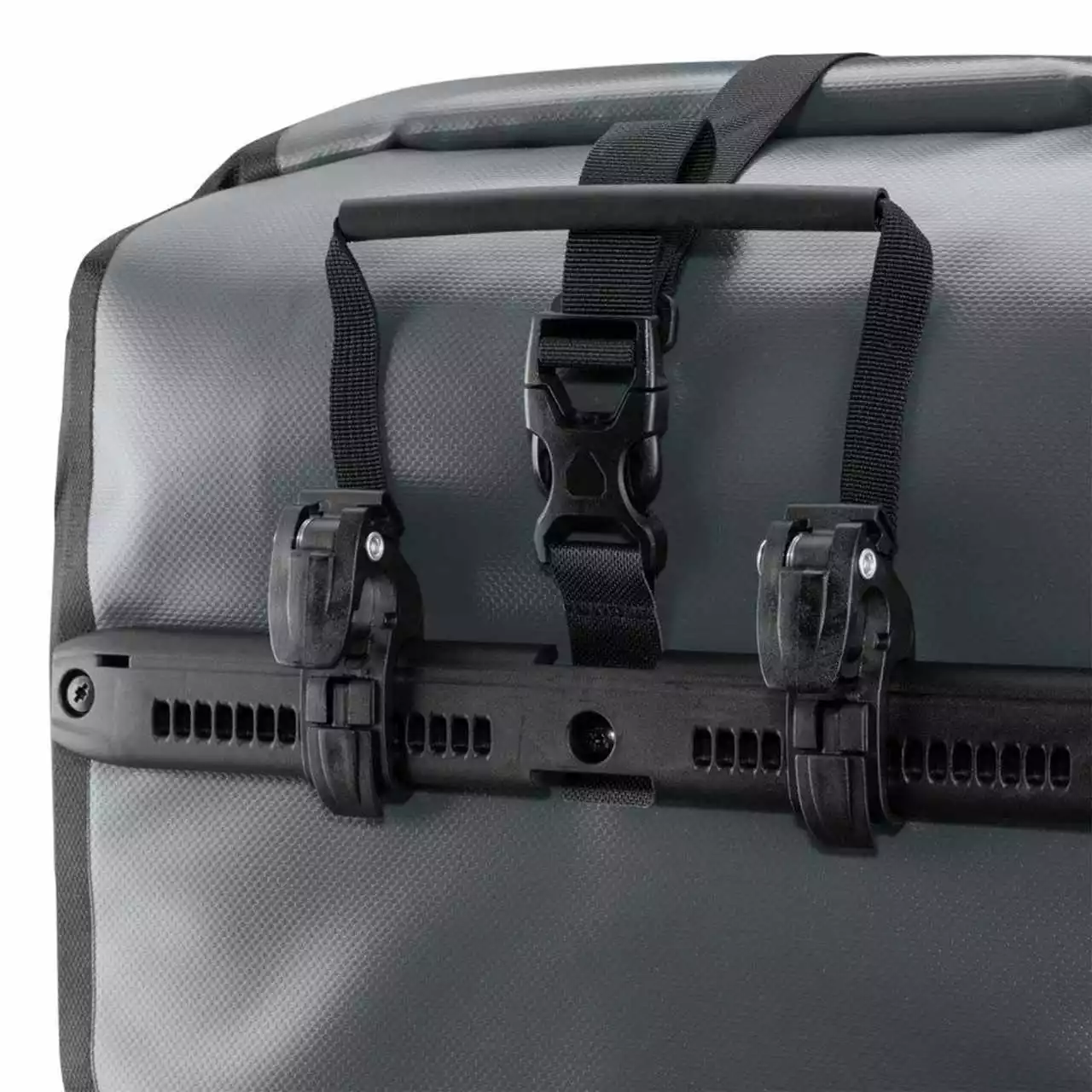 Robustes Polyestergewebe macht ihn zum langlebigen Touren-Begleiter. Ausgestattet mit hermetischen Rollverschlüssen sorgt er dafür, dass Verpflegung und Equipment sicher verpackt und wasserdicht geschützt am Ziel ankommen. Mit dem Quick-Lock2.1-Aufhängesystem lässt sich der Klassiker einfach und schnell am Rad befestigen und wieder abnehmen. Beim Transport zu Fuß sorgt der Schultergurt für ein angenehmes Tragegefühl.