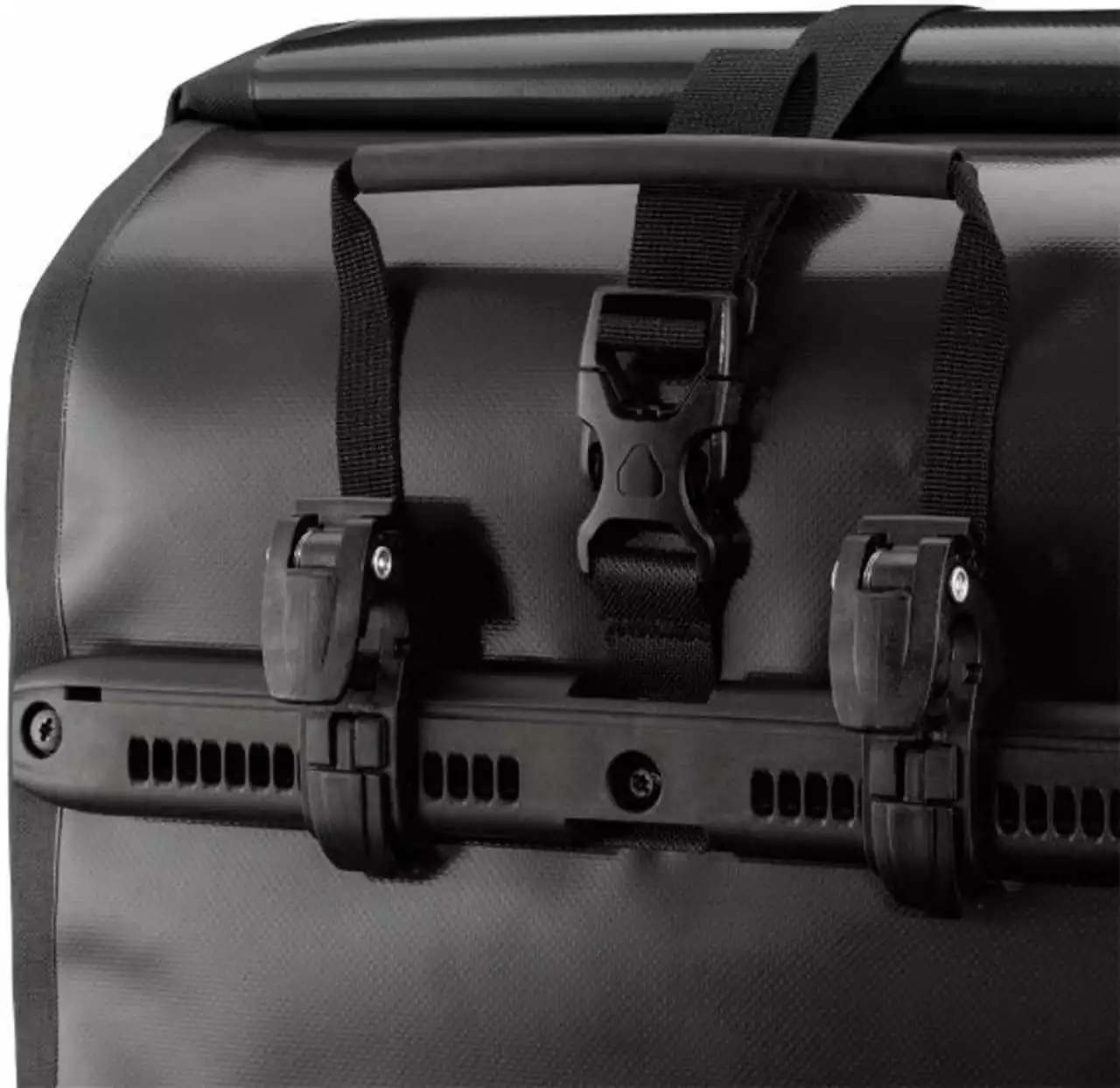 Dank dem praktischen Quick-Lock2.1 Halterungssystem mit selbstschließenden Haken lassen sich die Taschen schnell und einfach an fast allen Gepäckträgern einhängen. Das System ist ohne Werkzeug verstellbar, die 16mm Haken können mit beiliegenden Einsätzen verkleinert werden (8, 10 und 12mm). Die untere Hakenschiene dient zur zusätzlichen Fixierung und verfügt über weichere Auflagenflächen, was besonders schonend für den Gepäckträger ist. Dank drehbarem Quick-Lock2.1-Arretierungshaken ist das System an praktisch jeden Gepäckträger anpassbar.