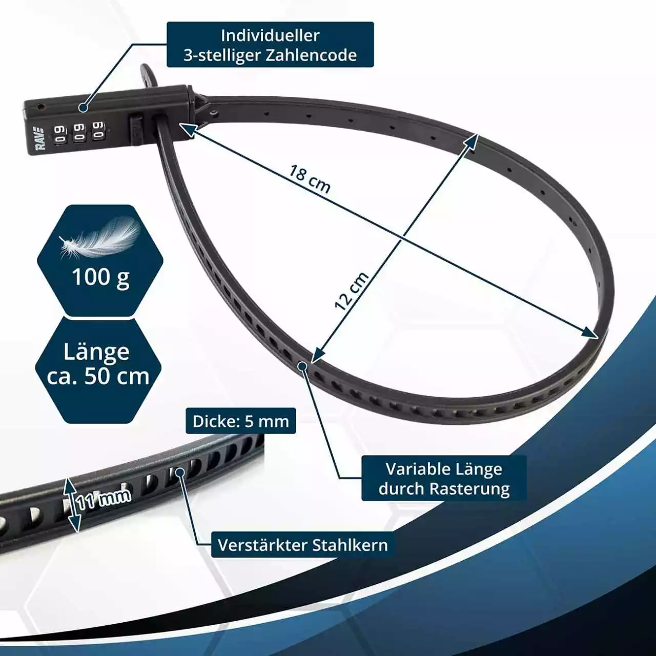 Zudem ist dieses Kabelbinder-Schloss (weil es wie ein Kabelbinder aussieht und ähnlich funktioniert) extrem leicht. Gerade einmal 100 Gramm bringt das Schlösschen auf die Waage. Der verstärkte Stahlkern sorgt dafür, dass niemand dein Bike, deinen E-Scooter, deinen Helm, etc. spontan mitgehen lässt. Das Schloss kannst du platzsparend in einer Trikot-Tasche transportieren oder in einer Gepäcktasche verstauen.