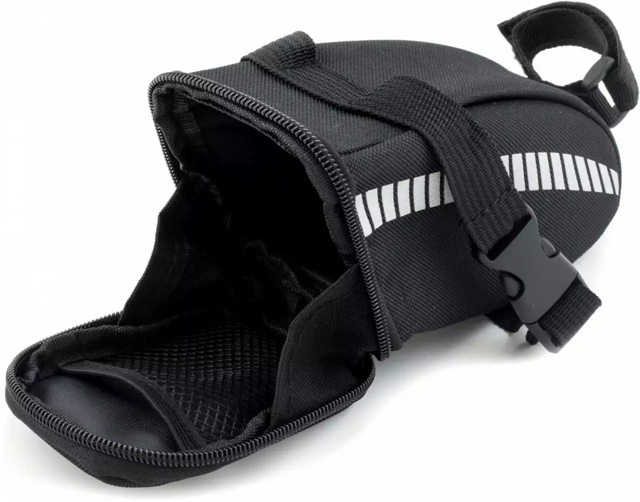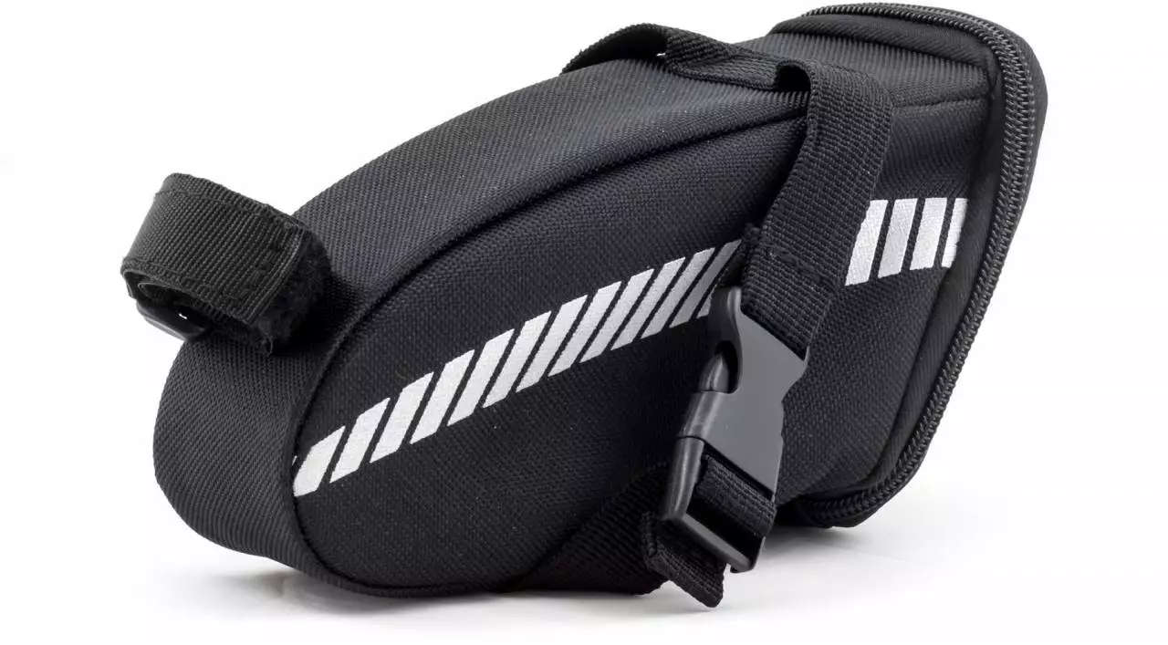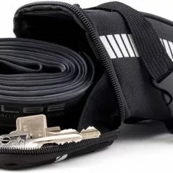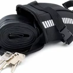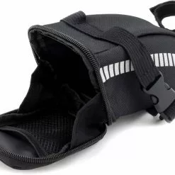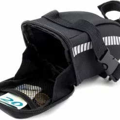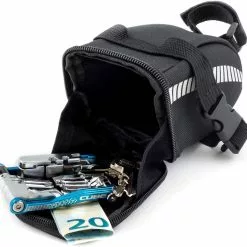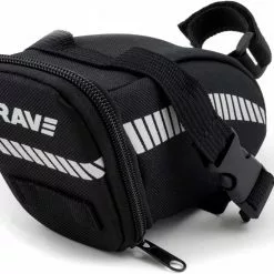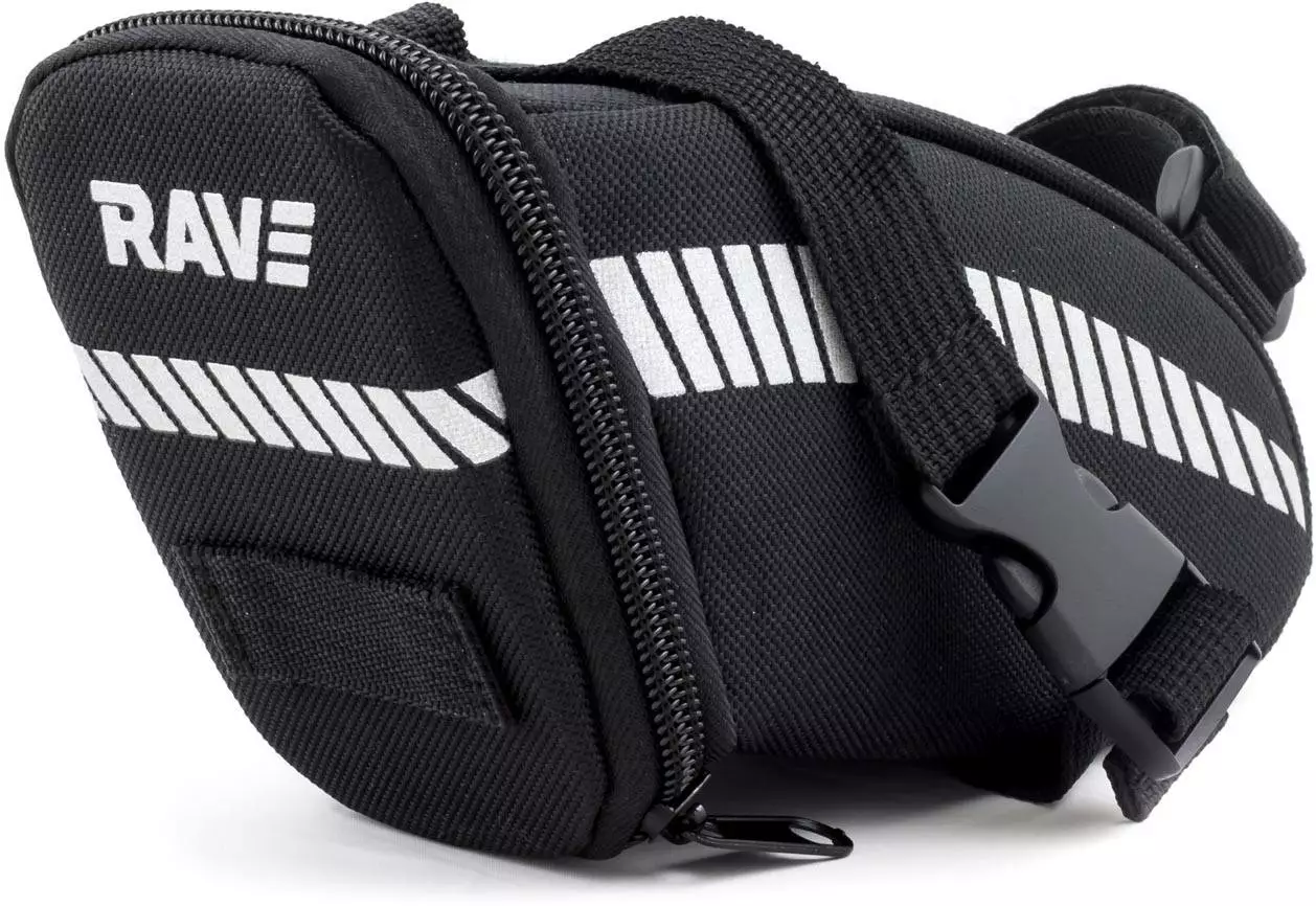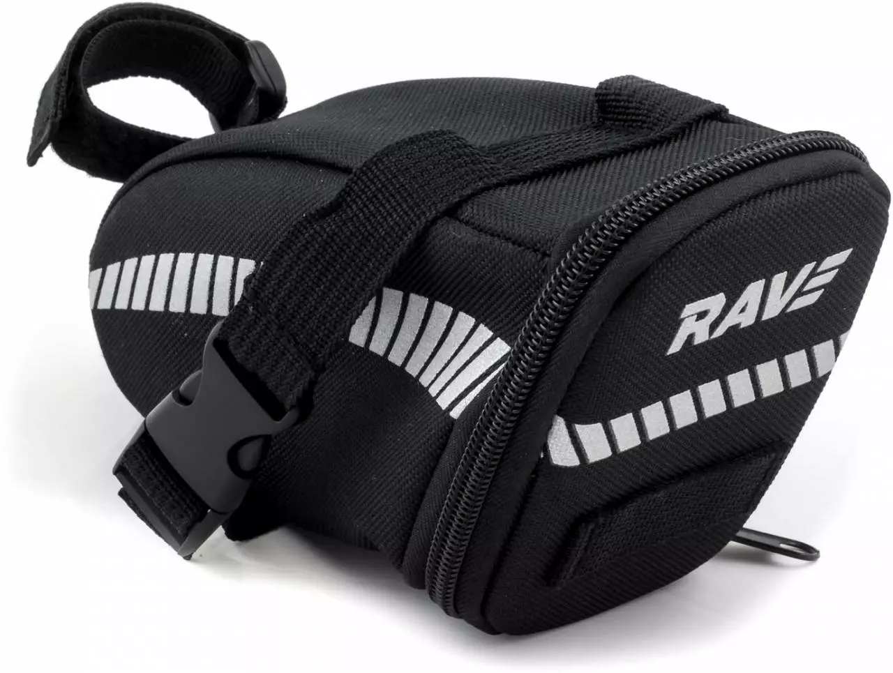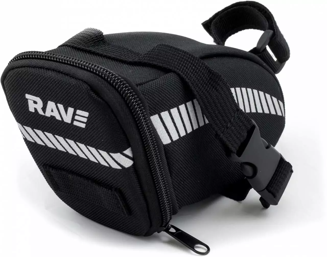 Die Satteltaschen von RAVE stehen für Qualität und Sicherheit. Sie überzeugen durch das widerstandsfähige und wasserabweisende Kunststoffgewebe. Sie eignen sich für den Transport von wichtigen Utensilien, wie Ersatzschlauch, Werkzeug, Handy, etc. und verfügen über ein Innenfach für Geld und Flickzeug. Mit einem Gewicht von 100 g ist unsere Satteltasche L mit dem etwas größeren Volumen immer noch ein Leichtgewicht und durch das Strap-On System innerhalb weniger Sekunden ohne Werkzeug abnehmbar. So kann es jederzeit an einem anderen Fahrrad befestigt werden. Das Sicherheits-Reflektorband sorgt zusätzlich für mehr Sichtbarkeit für von hinten auffahrende Fahrzeuge in der Nacht. Die RAVE Satteltasche ist mit einer Lasche für ein LED-Licht ausgestattet.