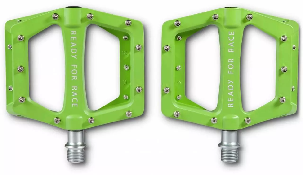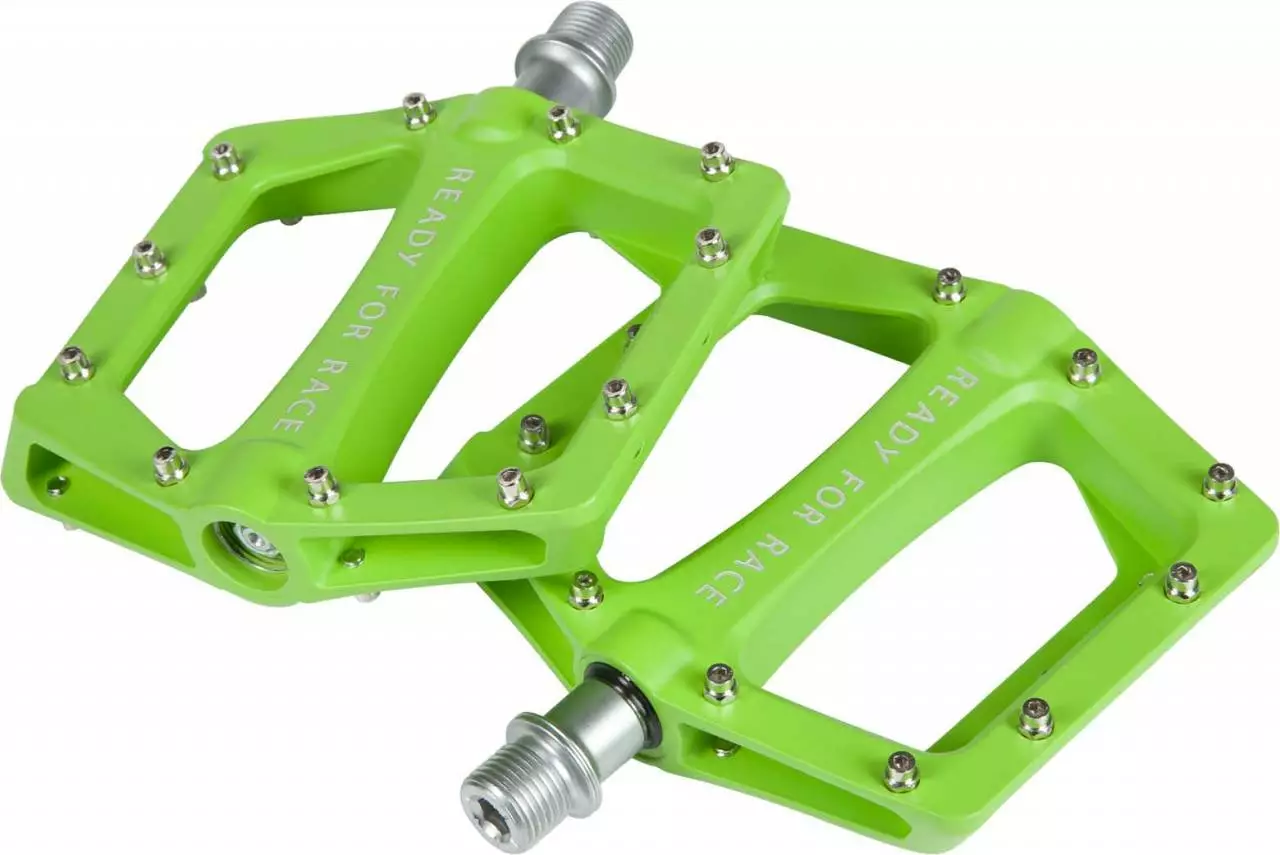 Die leichten Flat-Pedale sind aus Aluminium hergestellt und werden mit einer Cr-Mo-Achse verbaut. Die Anti-Rutsch-Pins sind austauschbar und bieten besten Halt am Fahrrad.
