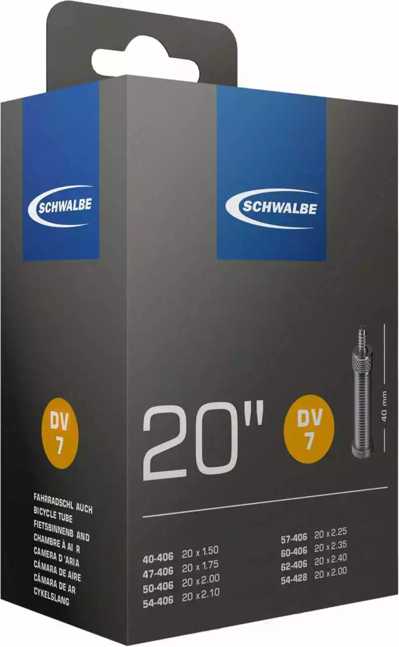 Schwalbe Standard Fahrradschlauch Nr. 7. Für Fahrradreifen in der Größe 20″ Zoll (ETRTO 40/62-406/428). Hält die Luft überdurchschnittlich lang. Dank bester Materialgüte und gleichmäßiger Wandstärke. Höchste Zuverlässigkeit, die sich millionenfach bewährt hat.