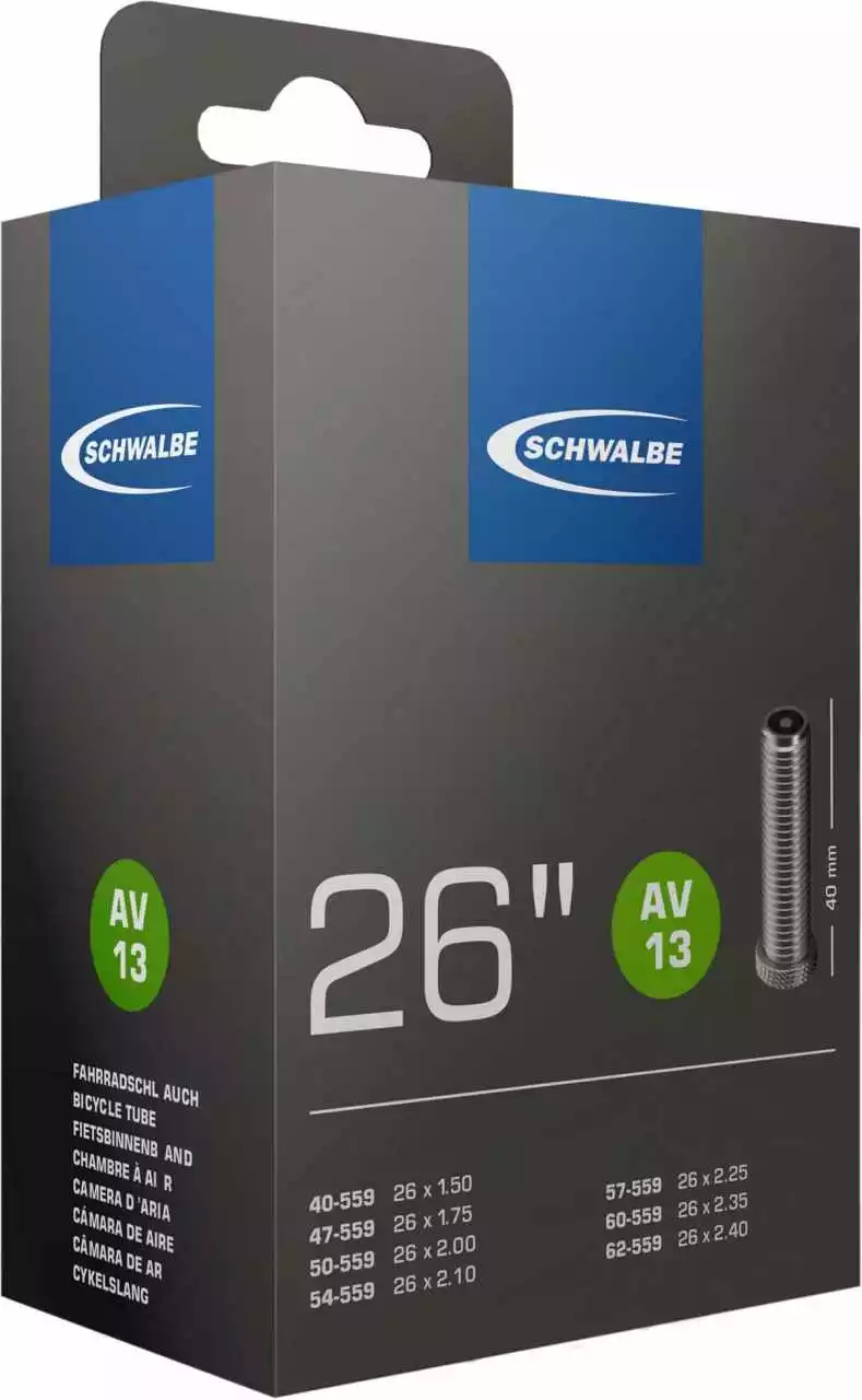 Schwalbe Standard Fahrradschlauch Nr. 13. Für Fahrradreifen in der Größe 26″ Zoll (ETRTO 40/62-559). Besonders geeignet für MTB. Hält die Luft überdurchschnittlich lang. Dank bester Materialgüte und gleichmäßiger Wandstärke. Höchste Zuverlässigkeit, die sich millionenfach bewährt hat.
