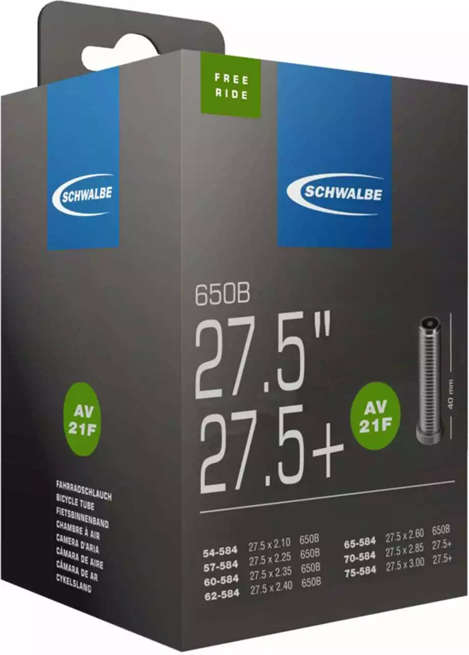 Schwalbe FREERIDE Fahrradschlauch Nr. 21F. Für Fahrradreifen in der Größe 27.5″ Zoll (ETRTO 54/75-584). Ideal für Fahrer, die Wert auf großes Volumen bei geringem Gewicht legen.