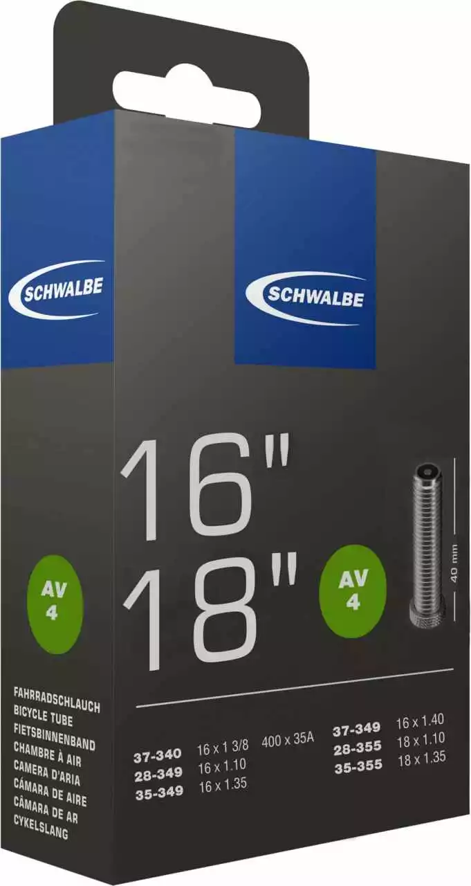 Schwalbe Standard Fahrradschlauch Nr. 4. Für Fahrradreifen in der Größe 16″ und 18″ Zoll (ETRTO 28/37-340/355). Hält die Luft überdurchschnittlich lang. Dank bester Materialgüte und gleichmäßiger Wandstärke. Höchste Zuverlässigkeit, die sich millionenfach bewährt hat.