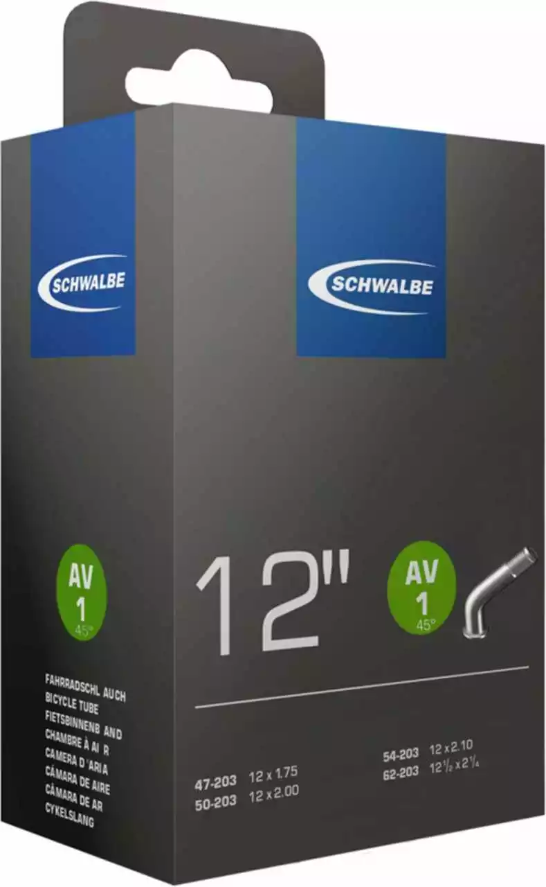 Schwalbe Standard Fahrradschlauch Nr. 1. Für Fahrradreifen in der Größe 12″ Zoll (ETRTO 47/62-203). Hält die Luft überdurchschnittlich lang. Dank bester Materialgüte und gleichmäßiger Wandstärke. Höchste Zuverlässigkeit, die sich millionenfach bewährt hat.