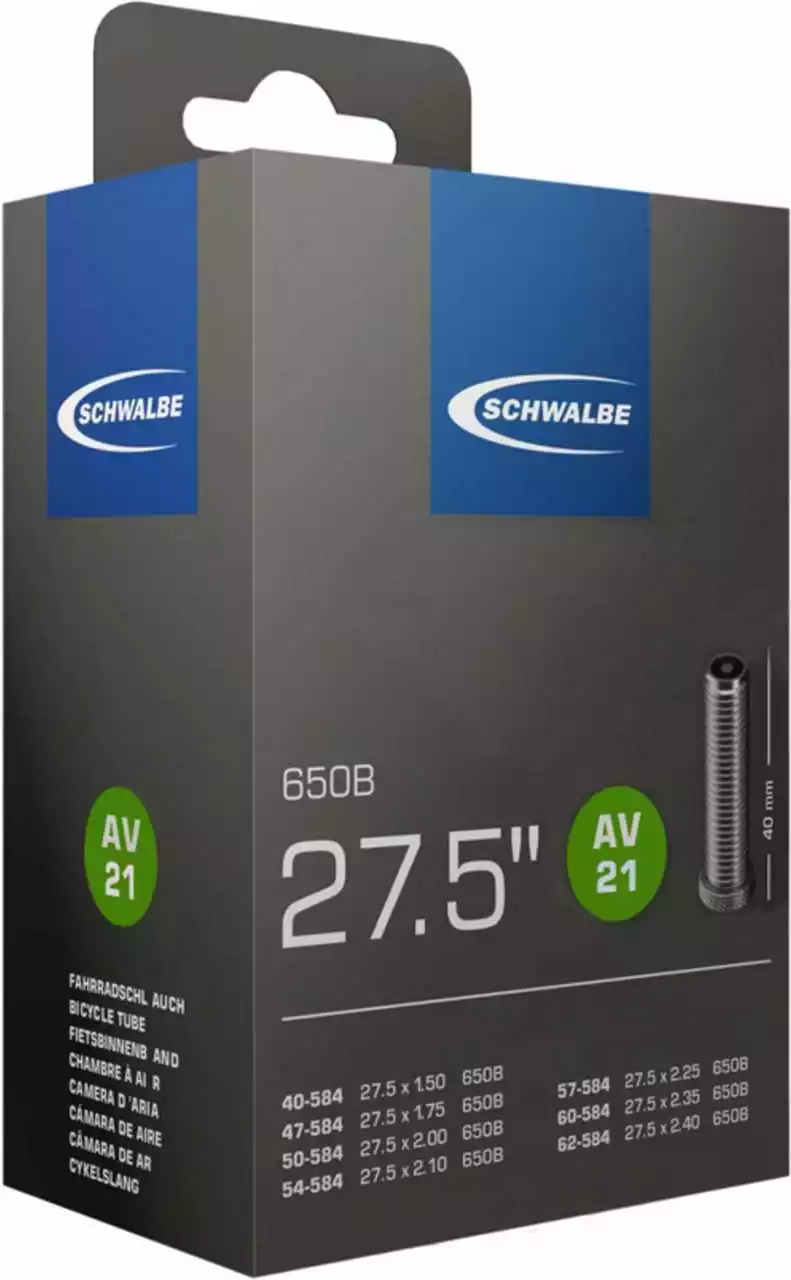 Schwalbe Standard Fahrradschlauch Nr. 21. Für Fahrradreifen in der Größe 27.5″ Zoll (ETRTO 40/62-584). Hält die Luft überdurchschnittlich lang. Dank bester Materialgüte und gleichmäßiger Wandstärke. Höchste Zuverlässigkeit, die sich millionenfach bewährt hat.