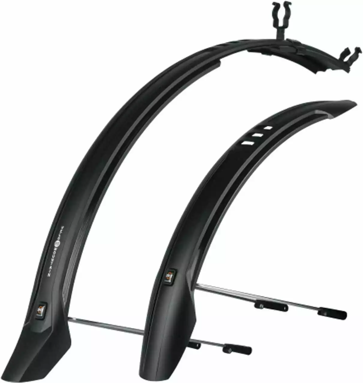 Das schwarze VELO 65 MOUNTAIN 29″ SET ist der große Bruder des VELO 42 und ein ideales Nachrüst-Kit für 29″ Mountainbikes. Dank der praktischen Universalbefestigung lässt sich das Set einfach und sicher an alle gängigen Rahmenrohre anbringen. Die Unterlaufstreben (im Lieferumfang enthalten) sorgen für eine bessere Stabilität der Steckradschützer. Geeignet bis zu einer Reifenbreite von 2.35″.