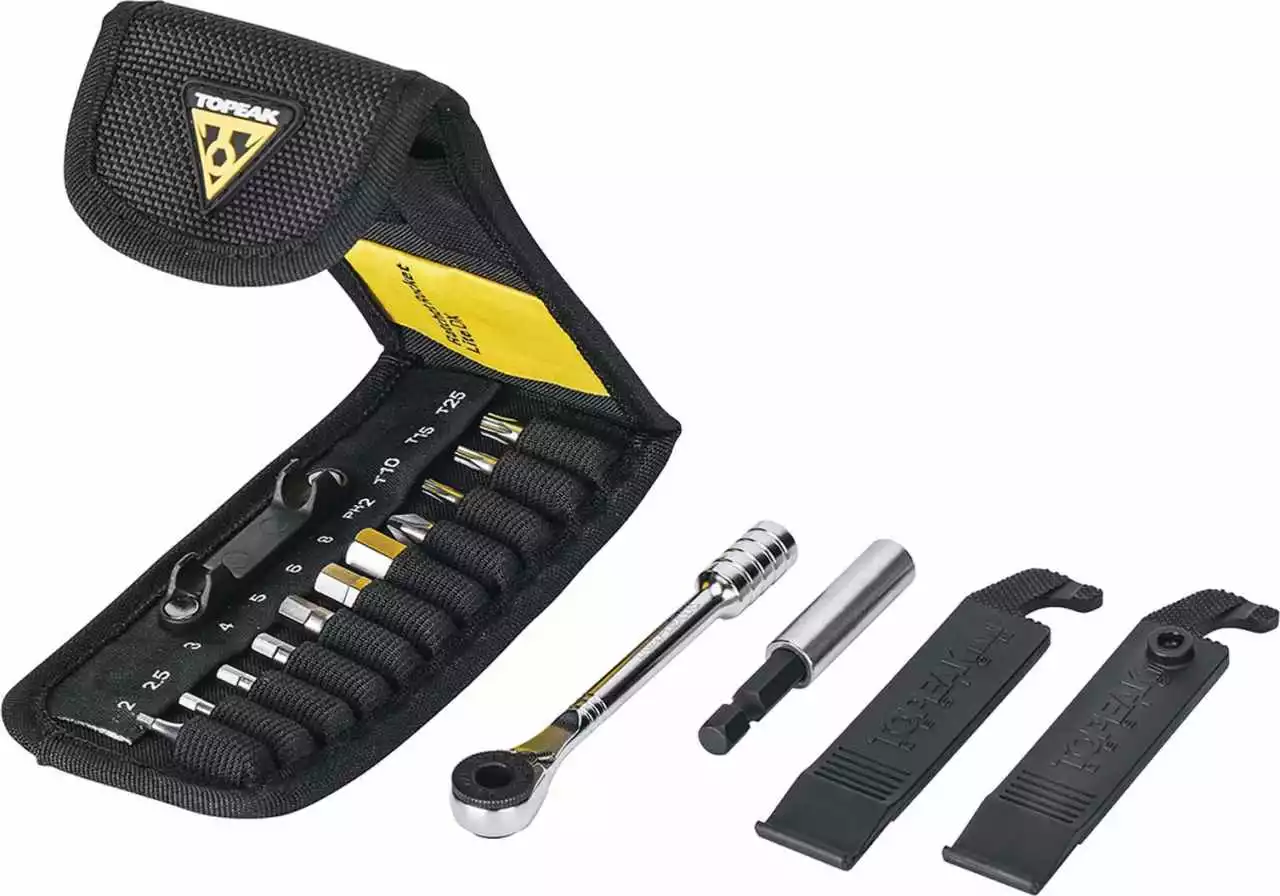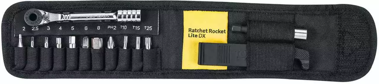 Umschaltbare Feinzahnratsche mit Präzisions-Daumenhebel für schnelle Richtungswechsel ohne Umsetzen, Daumenrad für Direktantrieb sowie Werkzeugbits aus gehärtetem Stahl (2 / 2,5 / 3 / 4 / 5 / 6 und 8 mm Inbus®, T10 / T15 / T25 Torx®, #2 Phillips), zwei Reifenhebern und einer magnetischen Verlängerung. NEU: Jetzt mit T15 Torx®-Bit für die Ninja- und Tri-Cage-Serie.
