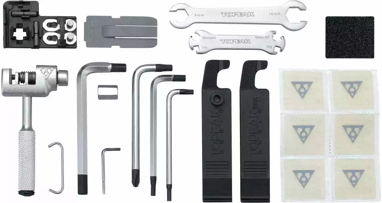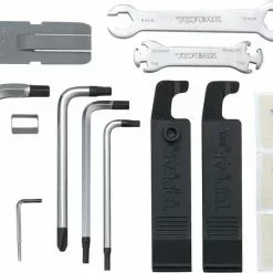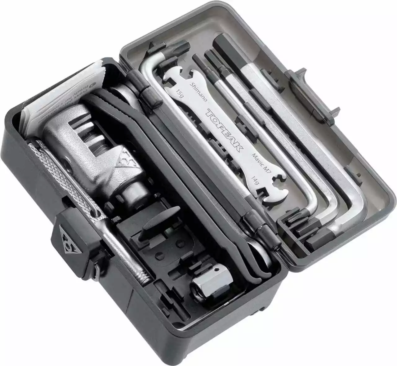 30 Funktionen Mini-Tool in einem Schutzcase, welches sich mit dem beiliegenden Gurt an jedem runden Rohr oder Sattelstütze (Ø 25 – 33 mm) befestigen lässt.