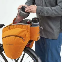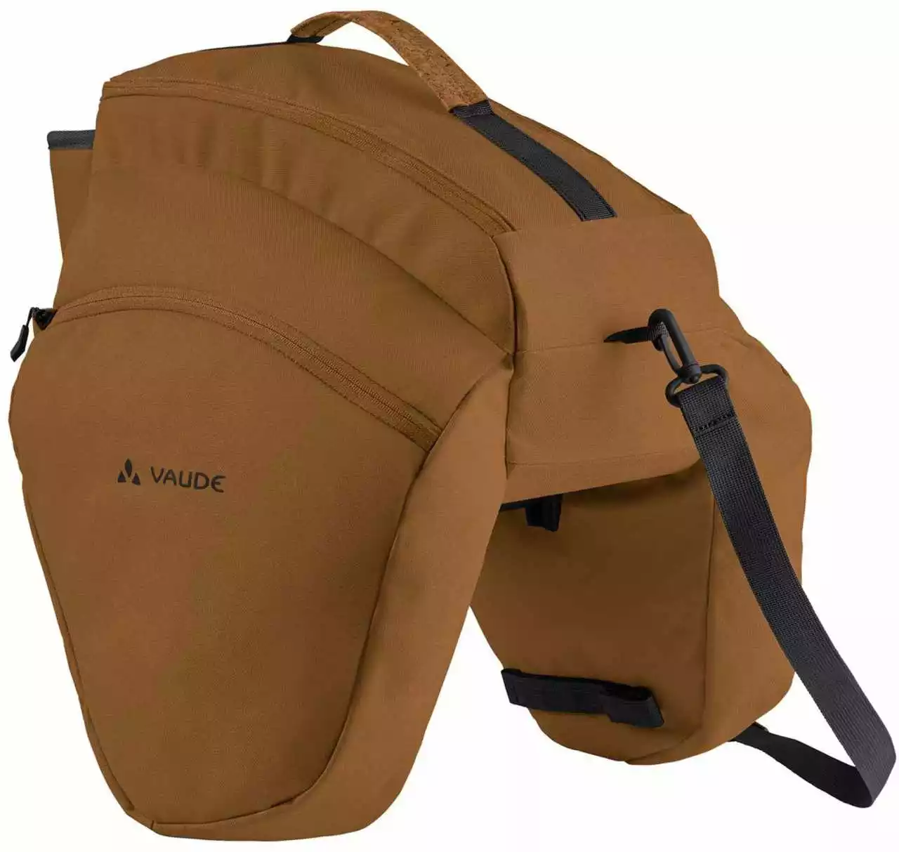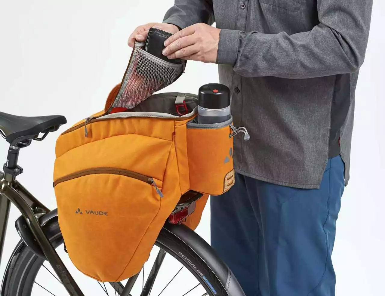 Die eSilkroad Plus Gepäckträgertasche aus recyceltem Polyester Material vereint ein robustes, sicheres UniKlip-Befestigungssystem mit einer Fächeraufteilung, die sich speziell an den Bedürfnissen von E-Bikern orientiert. Die Tasche verfügt über eine große Reißverschlusstasche an der Oberseite mit viel Platz für Wechselbekleidung und Brotzeit; die zwei Seitenfächer bieten darüber hinaus Platz für alle Accessoires, die man für längere Ausflüge mit dem E-Bike braucht. Ein abnehmbarer Schulterträger, eine Befestigung für ein Rücklicht und reflektierende Elemente runden die Ausstattung der eSilkroad Plus Fahrradtasche optimal ab. Klein aber fein sind auch die Details. Patches aus Kork, welche sich am Griff und der Blicklichthalterung befinden, fühlen sich nicht nur haptisch gut an, sondern stechen auch optisch hervor. Das VAUDE Green Shape-Label steht für ein umweltfreundliches, funktionelles Produkt aus nachhaltigen Materialien.