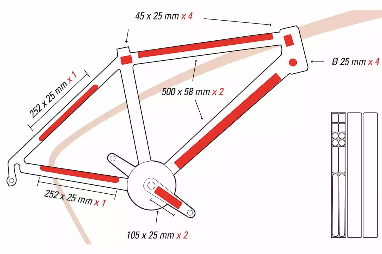 - Lieferumfang 1 Set mit 14 Stickern: 1 Sticker für Unterrohr 500 X 58 mm, 1 Sticker für Oberrohr 500 X 58 mm, 2 Sticker für Kettenstreben 252 X 25 mm, 2 Sticker für Druckstreben 105 X 25mm, 4 Sticker 45 X 25 mm, 4 Sticker Ø 25 mm